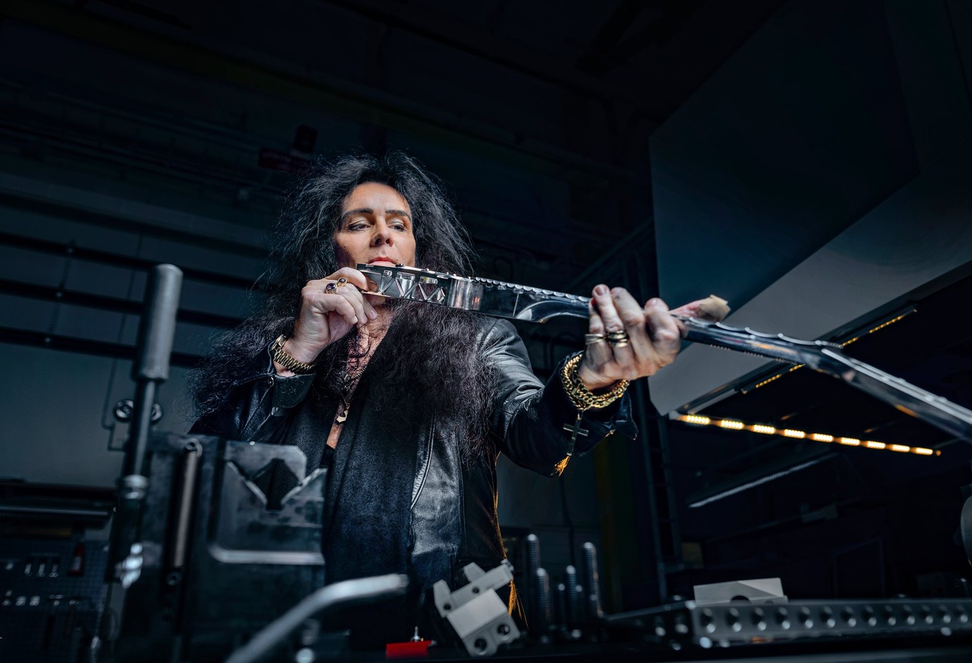 "The most important thing for me is the neck," says Yngwie Malmsteen, here checking the straightness.