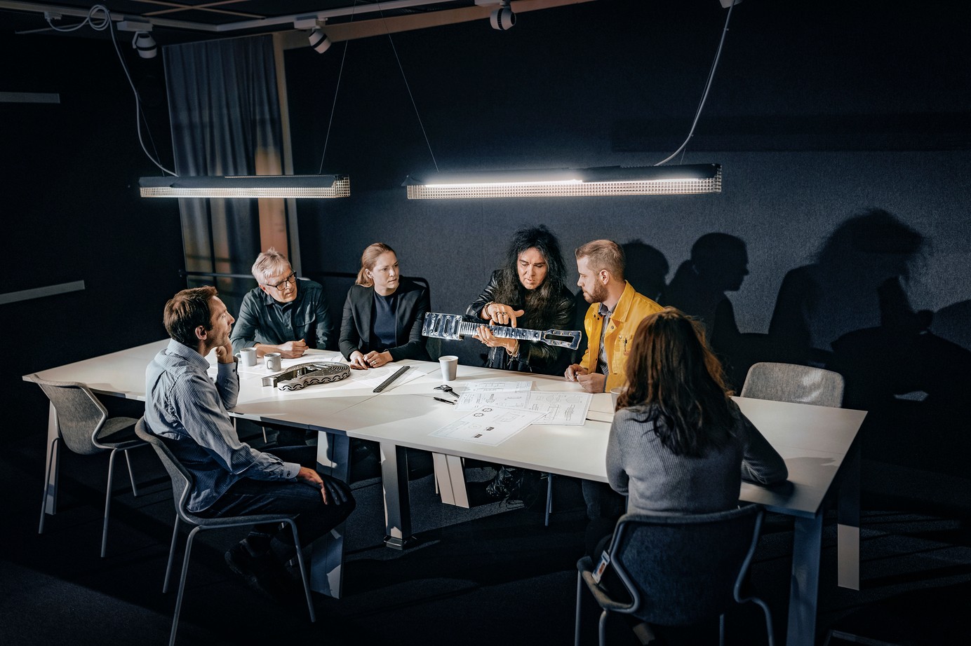 Yngwie Malmsteen discussing design details of the guitar neck and hub with members of the Sandvik team.