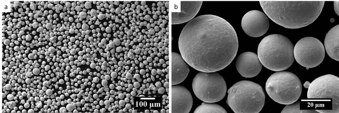 a) A low magnification SEM micrograph, b) A higher magnification SEM micrograph showing the spherical morphology of the gas atomized powders.