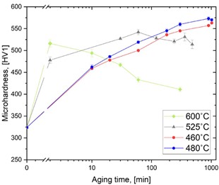Maximum hardness, approximately 550 HV (53 HRC), is typically reached after a heat treatment at 480°C/896°F for 6–10 hours, depending on the part size. Lower hardness can be achieved by aging at higher temperatures. The use of maraging steels in applications such as die casting tooling might require an aging temperature of approx. 525°C/977°F to achieve an overaged structure to ensure the thermal stability in service.