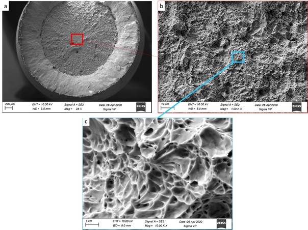 a) classic cup and cone fracture surface, SEMs with increased magnification, b) fracture surface showing a ductile features and c) at increased magnification.